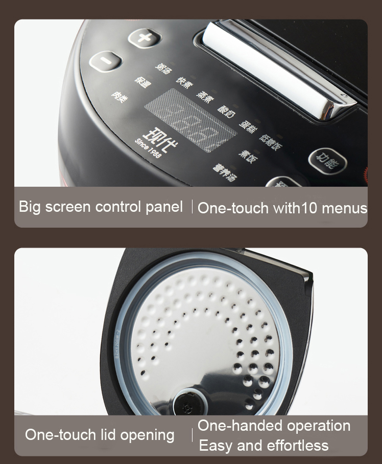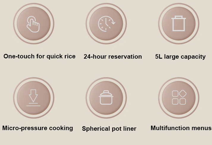 4.Face function keys: cooking rice, porridge, soup, steaming, reservation/heat preservation.