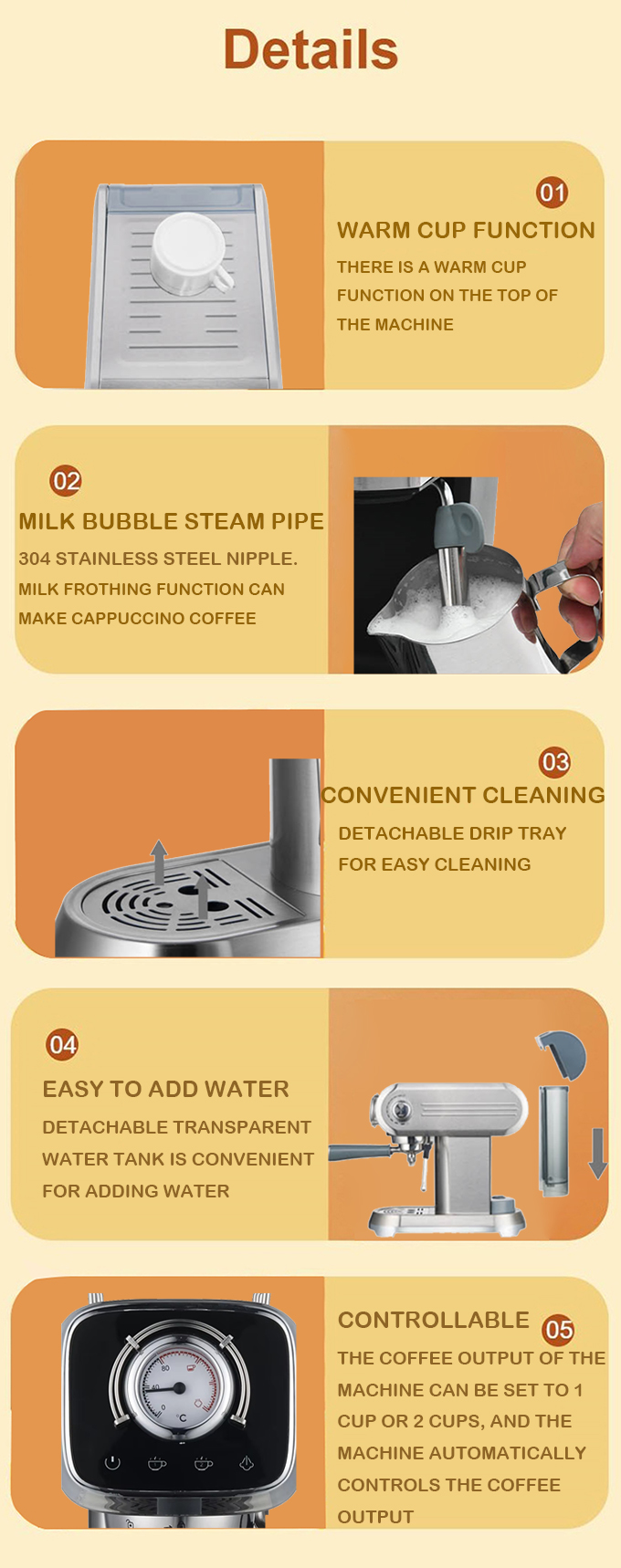 1.Stainless Steel Drip Tray & Stainless Steel Body 2.20Bar High-Pressure Pump System